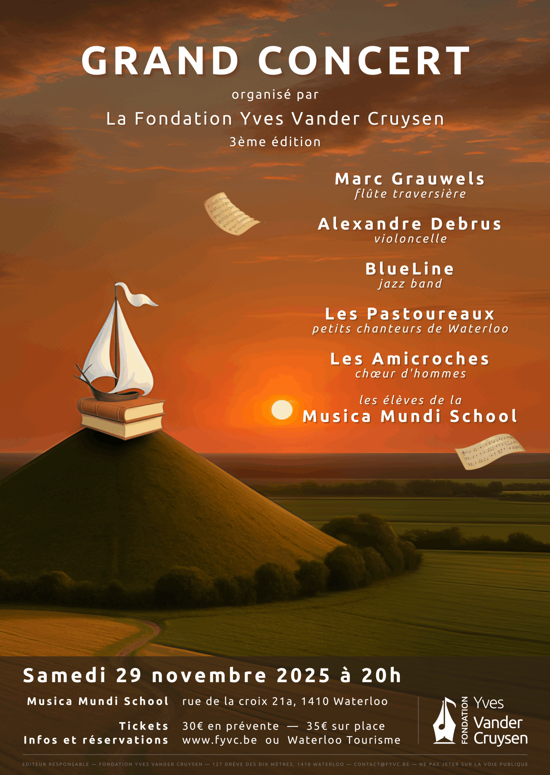 Pour sa 3ᵉ édition, le concert biennal de la Fondation Yves Vander Cruysen rassemble quelques-uns des plus beaux talents musicaux de Waterloo. Le violoncelliste Alexandre Debrus, le flûtiste Marc Grauwels, le Jazz band BlueLine, les élèves de la Musica Mundi School, les Pastoureaux, petits chanteurs de Waterloo, et le chœur d’hommes des Amicroches se succèderont sur scène pour offrir un programme riche et varié.