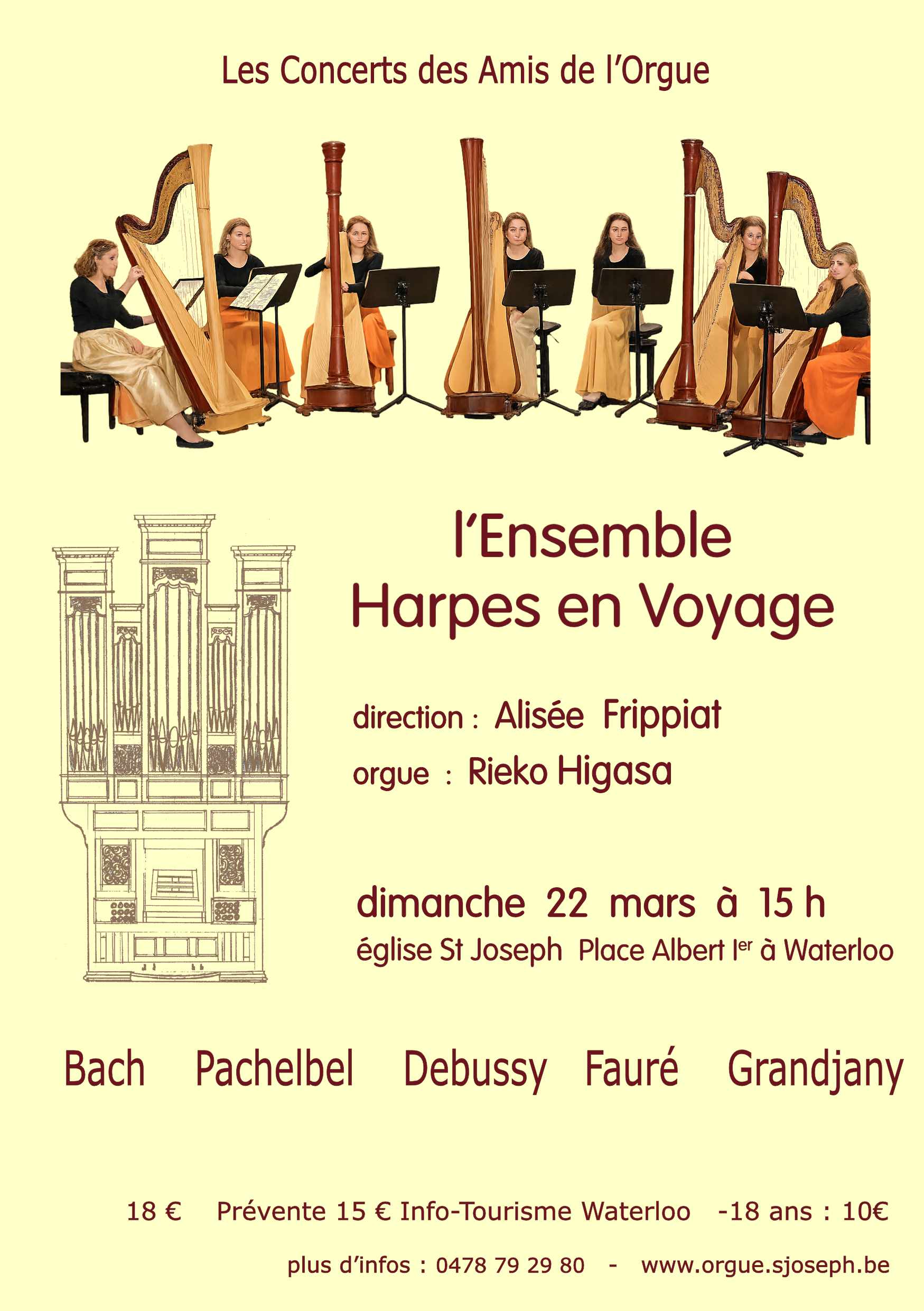 Sous la direction d’Alisée FRIPPIAT, l’ensemble de 9 jeunes femmes « Harpes en voyage » joindra ses douces sonorités à celles de l’orgue sous les doigts de Rieko HIGASA, dans un programme varié : Bach, Debussy, Fauré, Grandjany.