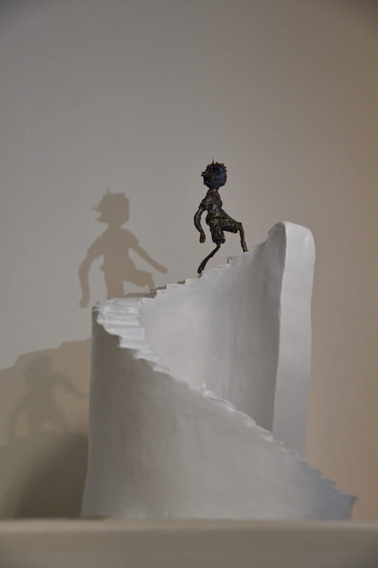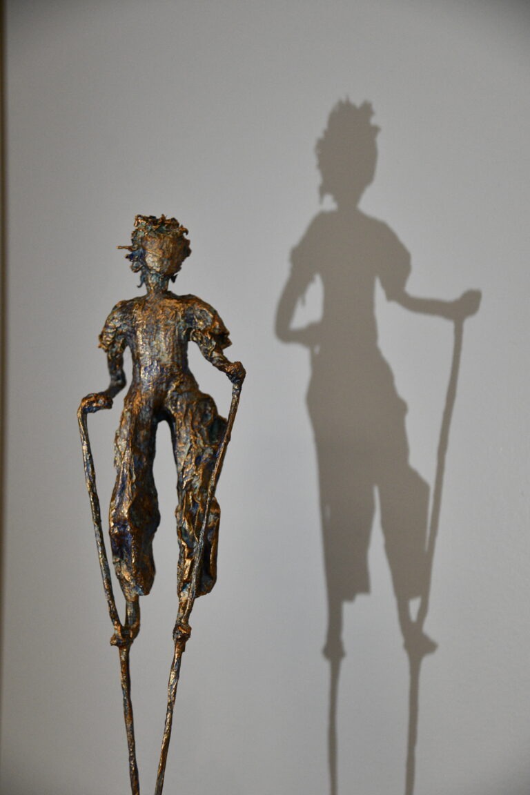Une patine acrylique vient parfaire chaque création en offrant un subtil effet bronze en trompe-l’œil. Les sculptures, fréquemment posées sur des sphères symbolisant la terre et la rondeur, jouent avec la lumière et projettent des ombres soigneusement calculées.