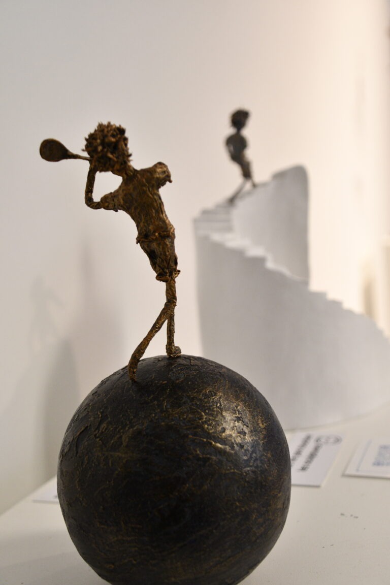 Née à Liège en 1966, l’artiste développe un travail singulier autour de la sculpture en papier. Ses personnages prennent forme grâce à de fines bandelettes, souvent issues de papier de récupération, appliquées avec patience sur une structure en fil de fer. Le résultat est à la fois détaillé, léger et parfois défiant la gravité.