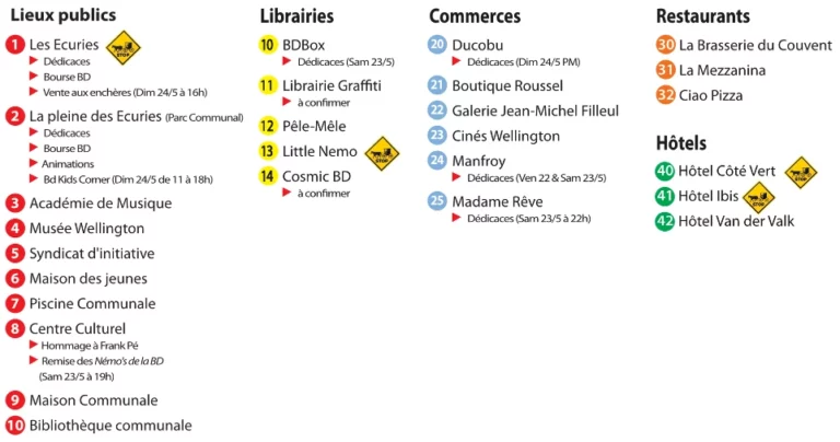 Le festival se déroule principalement aux Écuries et au Centre Culturel, mais aussi dans plusieurs librairies, commerces et lieux publics du centre-ville, tous accessibles à pied.